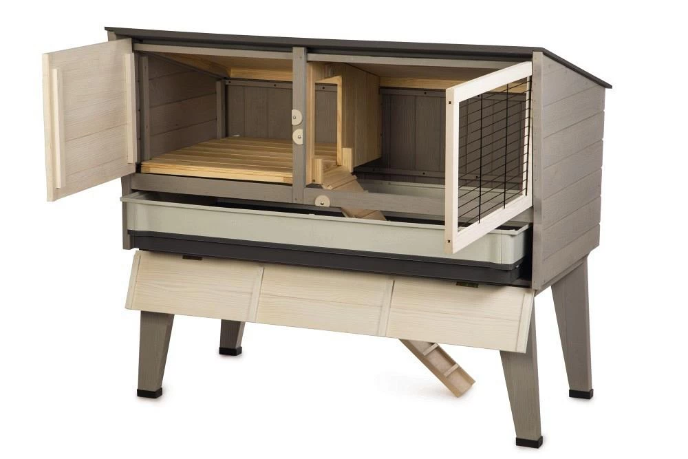 De hoog opstaande bak aan de binnenkant zorgt ervoor dat alles mooi in de kooi blijft en is eenvoudig schoon te maken. Er zijn twee trapjes te vinden in de kooi, waarvan ook een trap die tot onder de kooi gaat. Dit zorgt ervoor dat je de kooi ook uit zou kunnen breiden met een ren, om jouw konijn nog meer vrijheid te geven.
