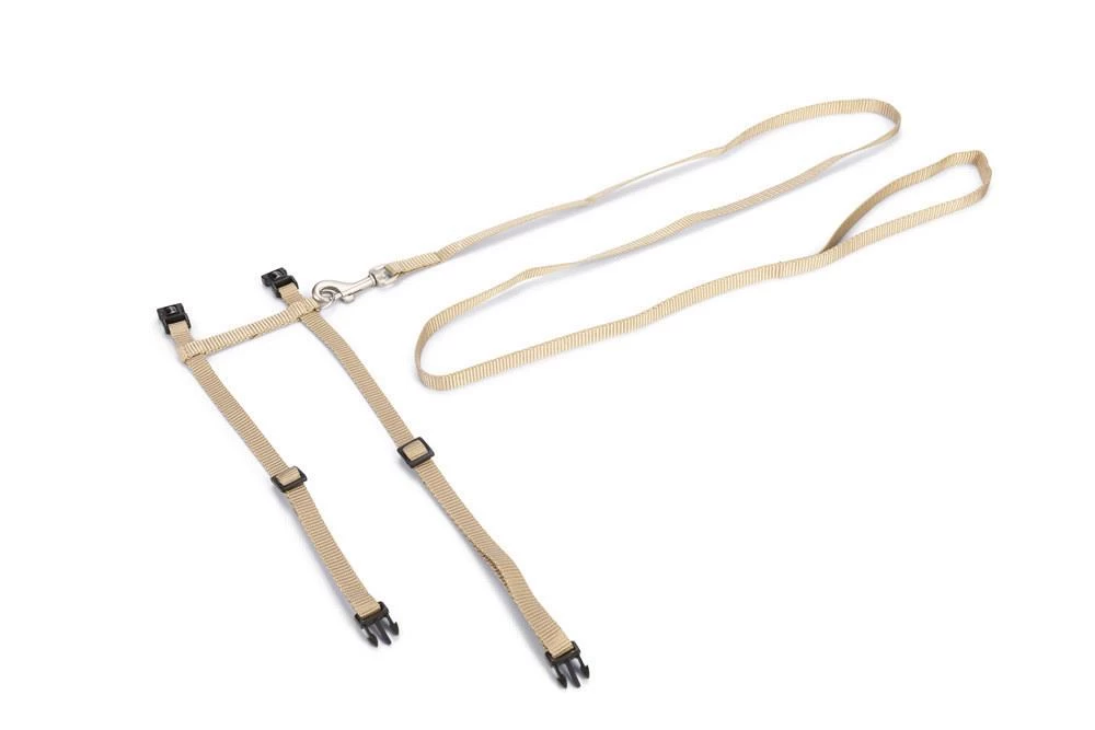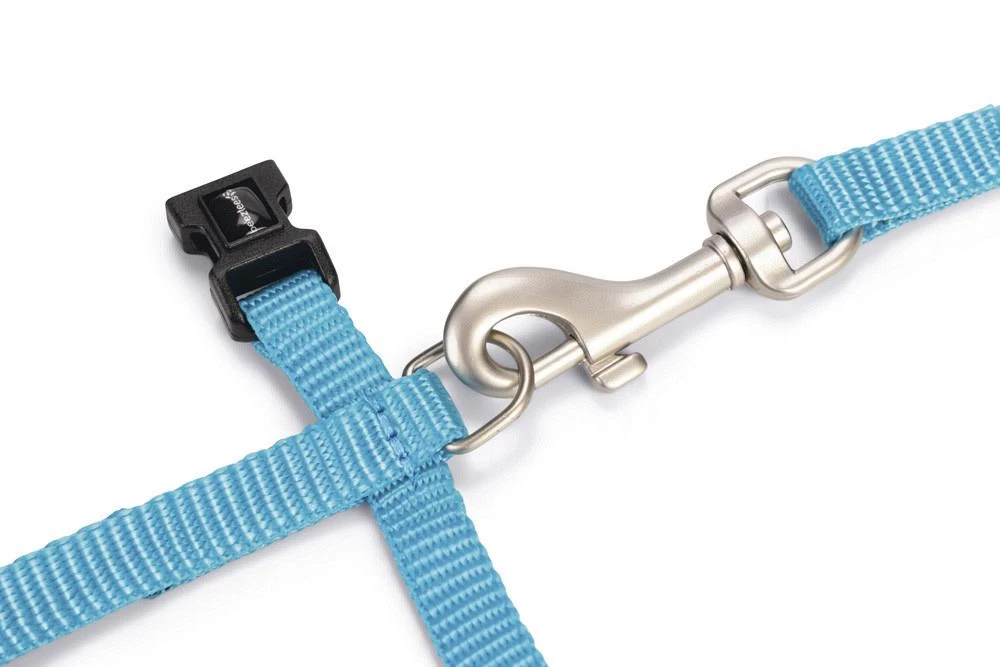 Het nylon tuigje is verstelbaar en kan worden bevestigd door middel van een kliksluiting.