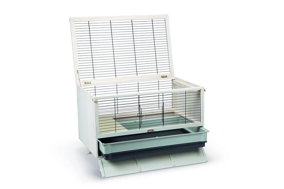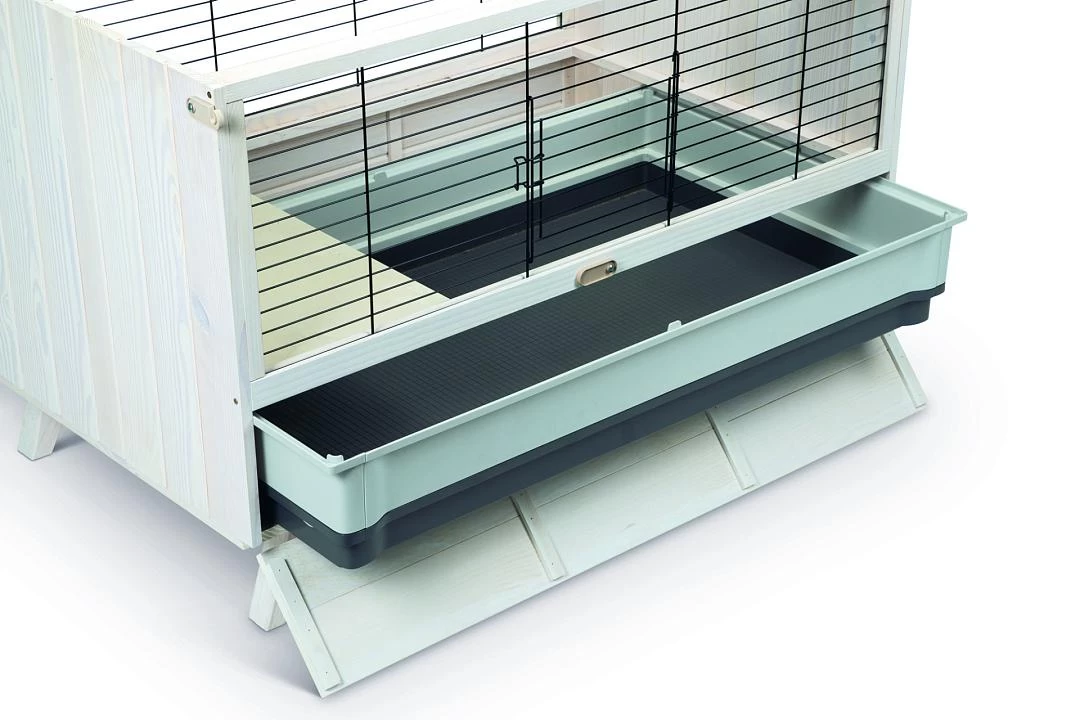 Het hok is gemaakt van duurzaam hout, is voorzien van een hoge onderbak en heeft een bodem van massief hout. De kooi is voorzien van een bovenklep die volledig open kan en die vast kan worden gezet door middel van een scharnier. Zowel de klep aan de bovenkant als de klep voor de uitschuifbare lade, kunnen vast worden gezet met een sluiting. Deze uitschuifbare lade zorgt er bovendien voor dat het schoonmaken van de konijnenkooi een stuk gemakkelijker wordt, zodat je het bijna leuk begint te vinden.