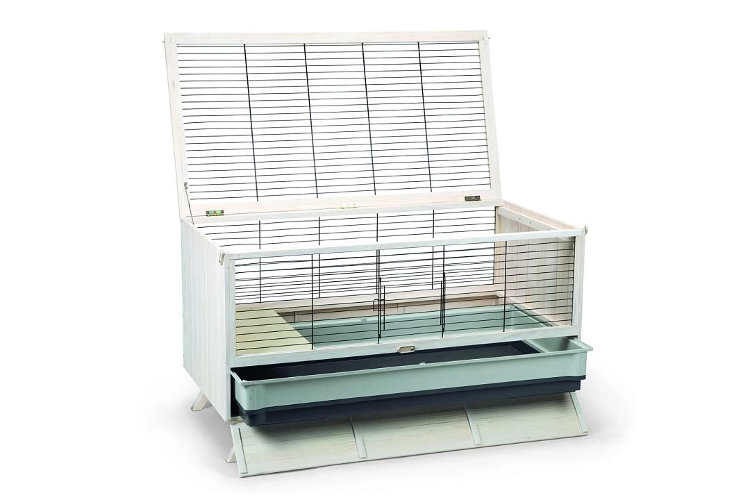 Het hok is gemaakt van duurzaam hout, is voorzien van een hoge onderbak en heeft een bodem van massief hout. De kooi is voorzien van een bovenklep die volledig open kan en die vast kan worden gezet door middel van een scharnier. Zowel de klep aan de bovenkant als de klep voor de uitschuifbare lade, kunnen vast worden gezet met een sluiting. Deze uitschuifbare lade zorgt er bovendien voor dat het schoonmaken van de konijnenkooi een stuk gemakkelijker wordt, zodat je het bijna leuk begint te vinden.