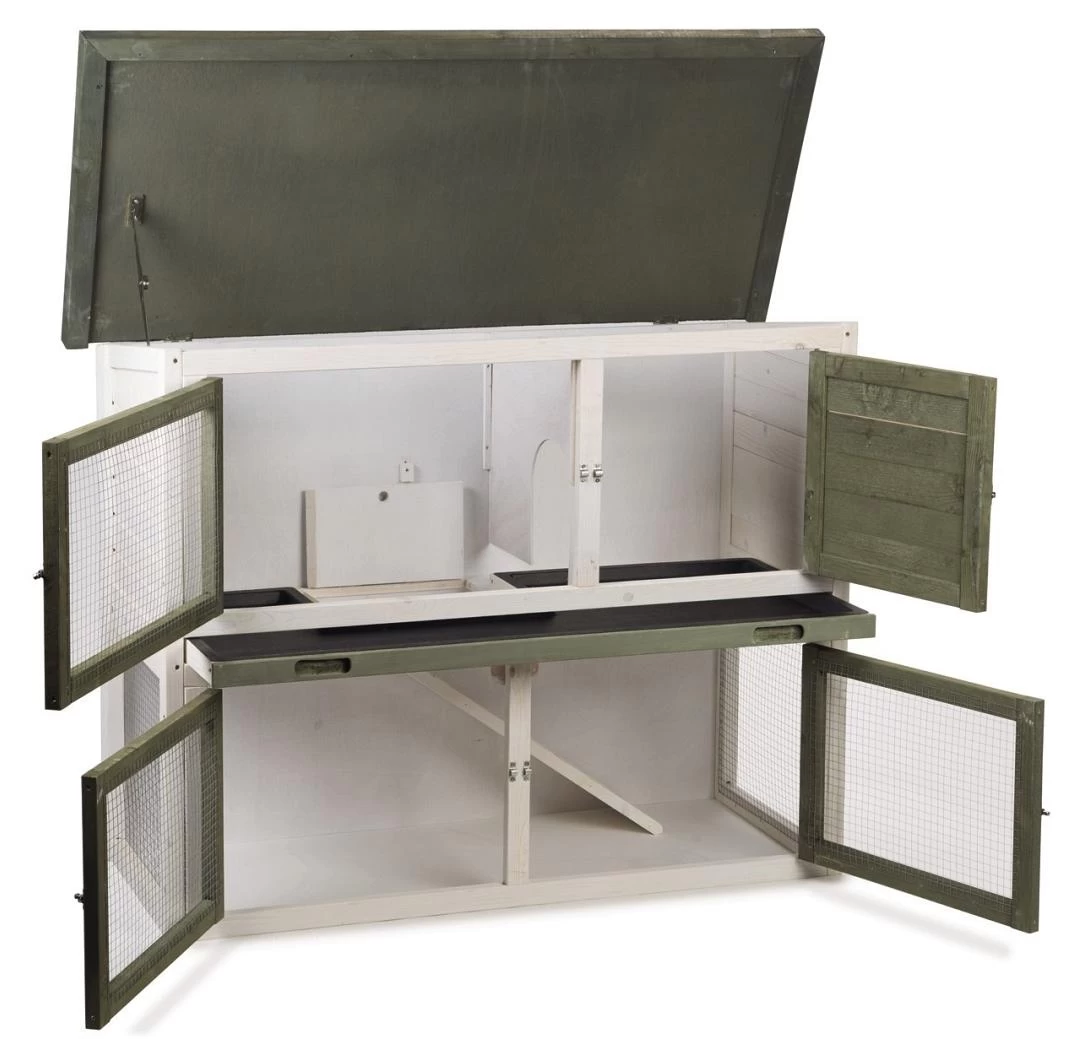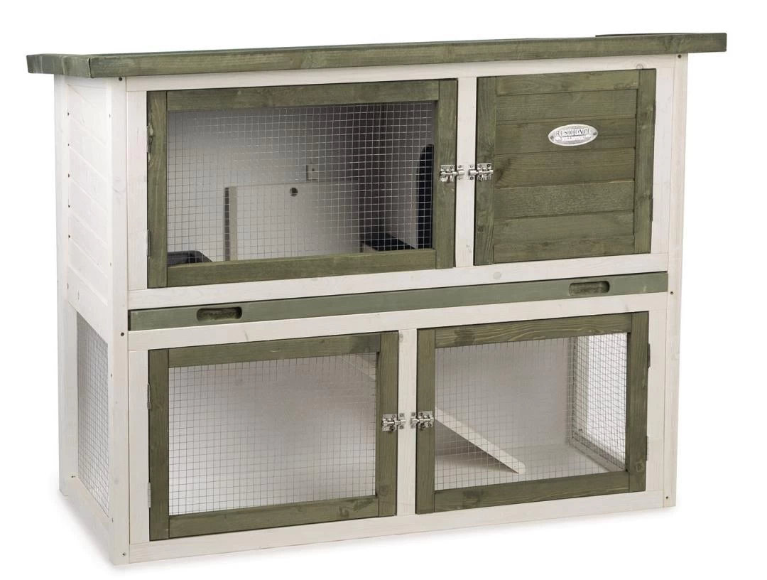 Dit konijnenverblijf bestaat uit twee verdiepingen. Onderin bevindt zich de ren, die makkelijk vanuit het bovenste gedeelte te bereiken is via het trappetje.