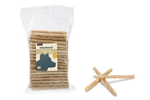 Beeztees gedraaide kauwstaafjes 9 tot 10 mm. Verpakt per 100 stuks. Premium Thaise kwaliteit. Een lekker tussendoortje voor uw hond.