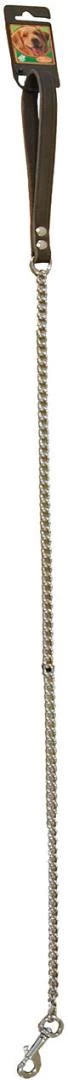 Deze hondenlijn met ketting heeft vele schakels en is voorzien van een leren handvat. Deze kettinglijn heeft een karabijnhaak en is daarmee eenvoudig te bevestigen aan de halsband.