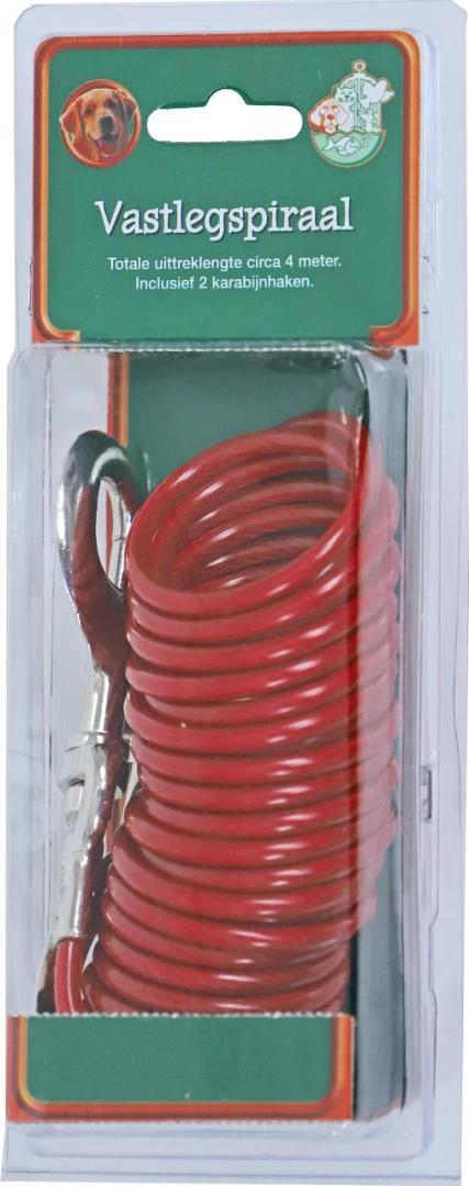 De vastlegspiraal is maximaal 4 mtr uitrekbaar. Aan beide zijde een muskatonhaak, draad is zeer lastig door te bijten.