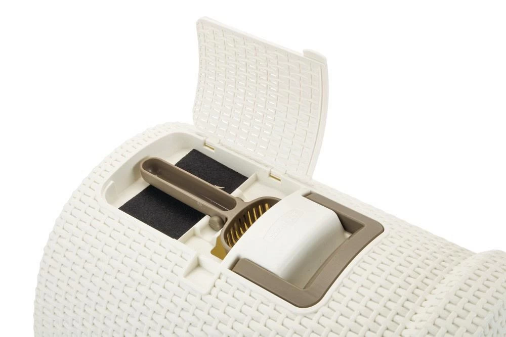 Een prachtig afgewerkte rotan kunststof kattenbak van Curver. Niet alleen een lust voor het oog maar ook zeer gemakkelijk in gebruik.