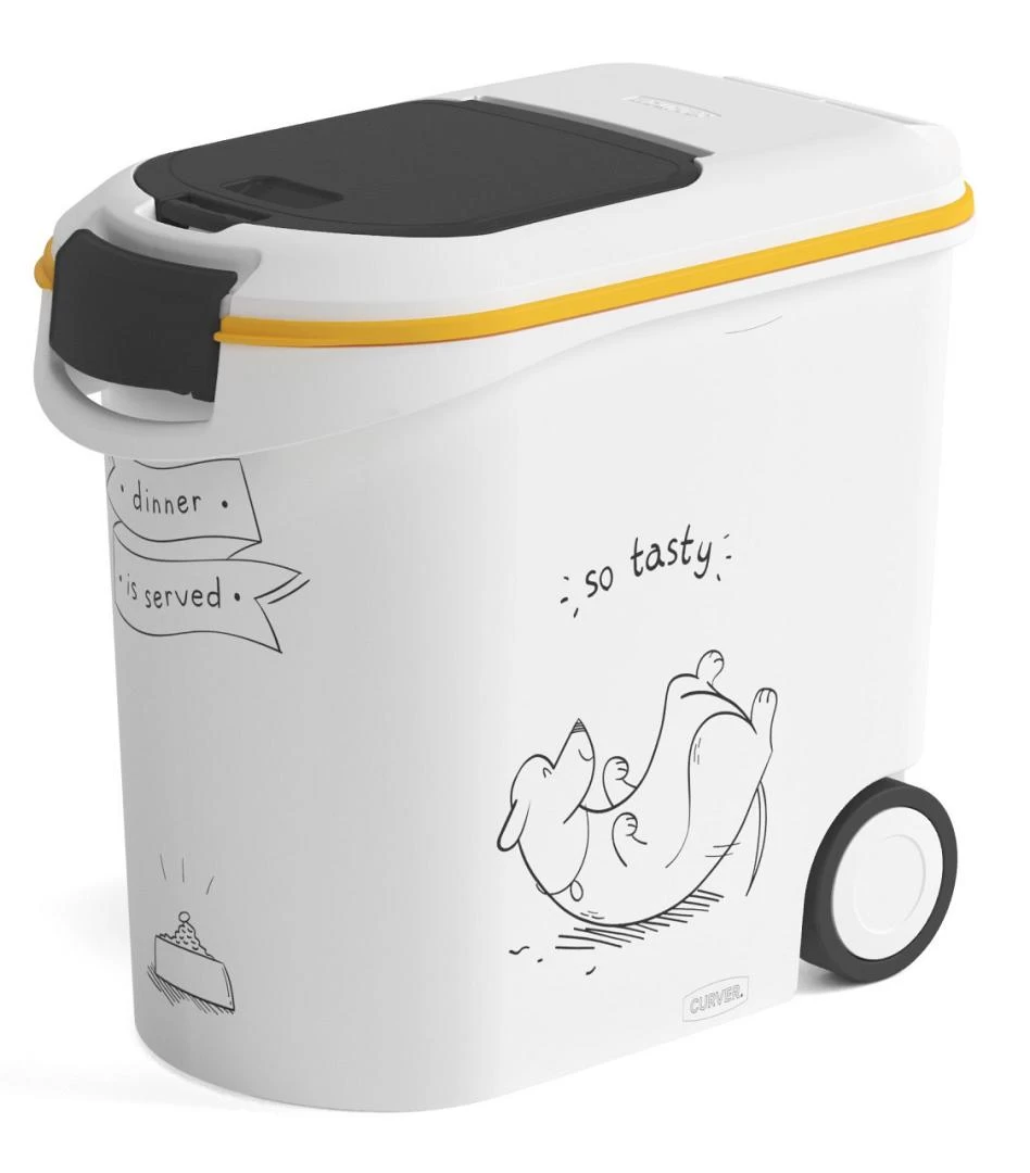 De Curver voedselcontainer ‘Dinner is Served’ hond is een zeer handige container voor het bewaren van hondenbrokjes. Met deze container heb je nooit meer een zak brokjes in de schuur of kelder, maar is het netjes opgeborgen in een fraai uitziende container.