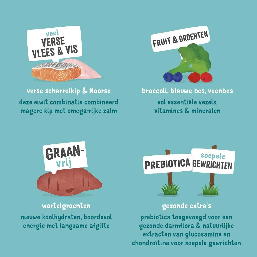 Samenstelling: verse kip 35%, bataten, erwten, verse zalm 5%, lijnzaad, erwteneiwit, kippensaus, mineralen, mannan-oligosachariden (MOS), fructo-oligosachariden (FOS), broccoli 0,04%, bosbessen 0,04%, vossenbessen 0,04%, cranberry’s 0,04%, boerenkool 0,04%, maca 0,04%, goudsbloemblaadjes, brandnetel, braambesblaadjes, venkel, karwij, kamille, melisse, glucosamine, chondroรฏtinesulfaat.