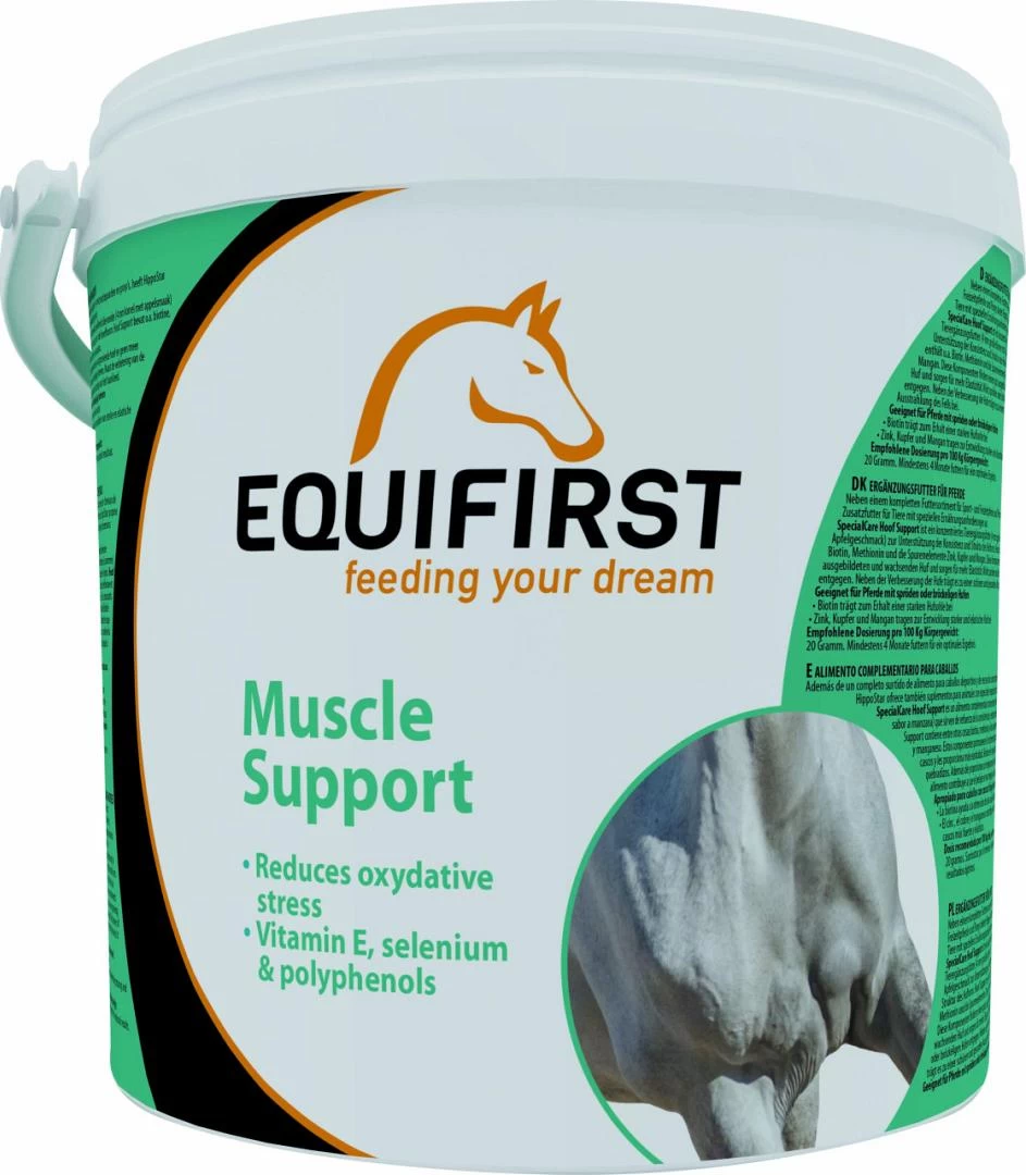 EquiFirst SpecialCare Muscle Support is voor paarden die volop in training staan. Muscle Support bevat natuurlijke antioxidanten, Vitamine E, Selenium en Magnesium. Bij lichamelijke inspanning kunnen spieren verzuren door ophoping van spierafvalstoffen. De natuurlijke antioxidanten en Vitamine E helpen om afvalstoffen in de spieren te neutraliseren en af te voeren. Het aanwezige magnesium draagt bij aan een soepele spiercoördinatie. Muscle Support ondersteunt het uithoudingsvermogen en paarden bewegen soepeler.
