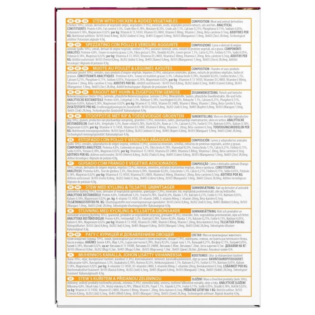 Samenstelling: Vlees en dierlijke bijproducten (kip 10%), granen, bijproducten van plantaardige oorsprong, groenten (1,9%), mineralen, zaden, plantaardige eiwitextracten, oliën en vetten.
