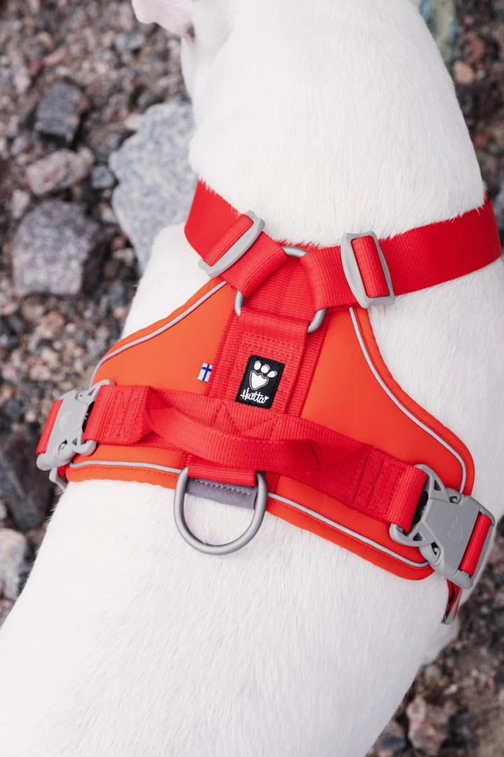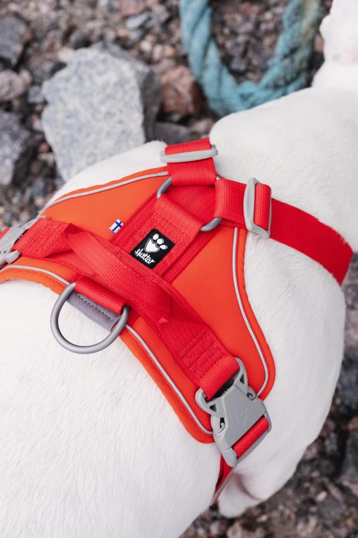 De duurzaamheid van kwetsbare onderdelen van het harnas en handvat is gewaarborgd met extra stiksel. Hurtta Outdoor, Weekend Warrior harness is voorzien van 3M reflecterende strepen voor zichtbaarheid in het donker. De metalen sluitingen zijn ontworpen en vervaardigd specifiek voor dit ontwerp. De treksterkte van de metalen onderdelen is getest door SGS. Andere gespen zijn gemaakt van duurzaam kwalitatief hoogwaardig kunststof. Dankzij de gespen aan beide zijden van de borst is het harnas gemakkelijk aan te doen en de hond hoeft zijn poten niet op te tillen.