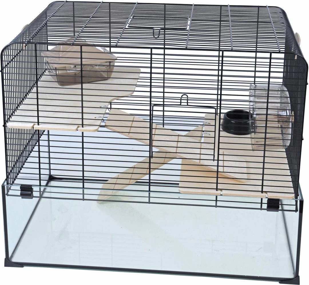 Deze kooi beschikt over een glazen onderbak, die graven zonder morsen mogelijk maakt, en heeft een tralie-bovenkant met twee houten plateau’s. De verdiepingen zijn met elkaar verbonden door middel van trappetjes en zijn aangekleed met een slaaphuisje, voerbakje en hamsterwiel.