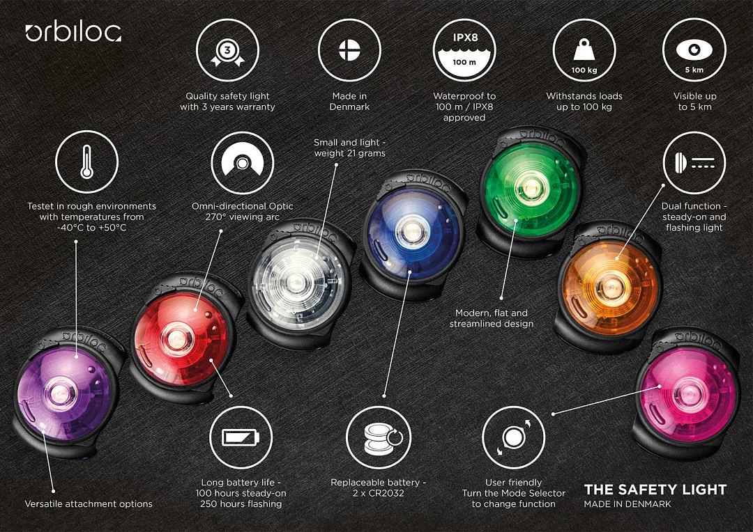 De Orbiloc lampjes zijn verkrijgbaar in verschillende kleuren. De kleurkeuze is afhankelijk van wanneer je het lampje wilt gebruiken en van de weercondities. Daarnaast kun je jouw hond onderscheiden dankzij een gekozen kleur of de kleur afstemmen op de hondenlijn, de halsband of het harnas. Wit licht reist sneller dan gekleurd licht, wat ervoor zorgt dat dit licht ook goed te zien is als deze door een dikke vacht heen moet schijnen. Zelfs dan is dit licht nog van veraf te zien.