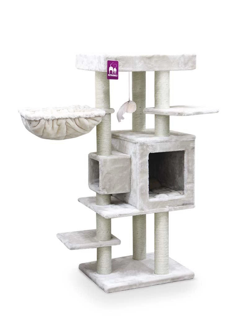 Dit chique Petrebels krabmeubel Kings & Queens Cleopatra 134 heeft alles wat jouw kat nodig heeft. De extra brede loungemand helemaal bovenin is perfect om alles en iedereen goed in de gaten te houden. De extra dikke krabstammen zijn perfect voor een manicure en je kat kan zich heerlijk terugtrekken in de luxe hangmand of het superfijne slaaphuisje.