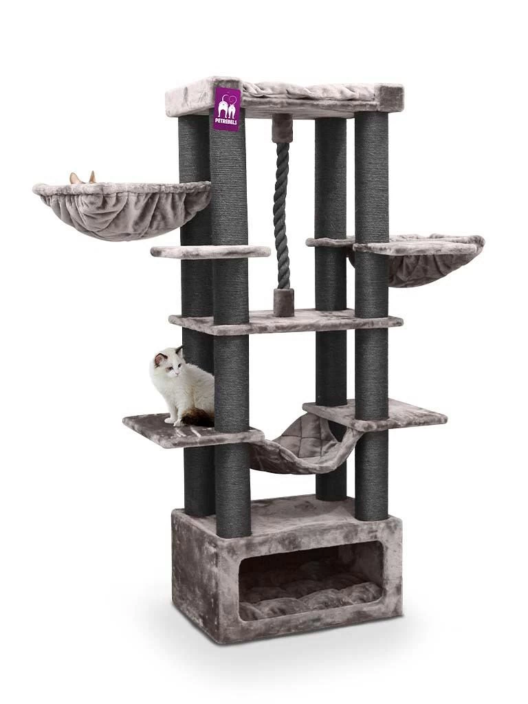 Petrebels krabmeubel Lucky Bastards Riverview 190 heeft ontelbaar veel fluweelzachte slaapplekjes, krabstammen van maar liefst 12 centimeter dik, een stoer speeltouw, twee fijne hangmatten en één nieuwe zwevende loungplek voor de echte luiwammesen. En mooi is hij ook, want door zijn strakke en vierkante vorm past hij bij elke woonstijl.