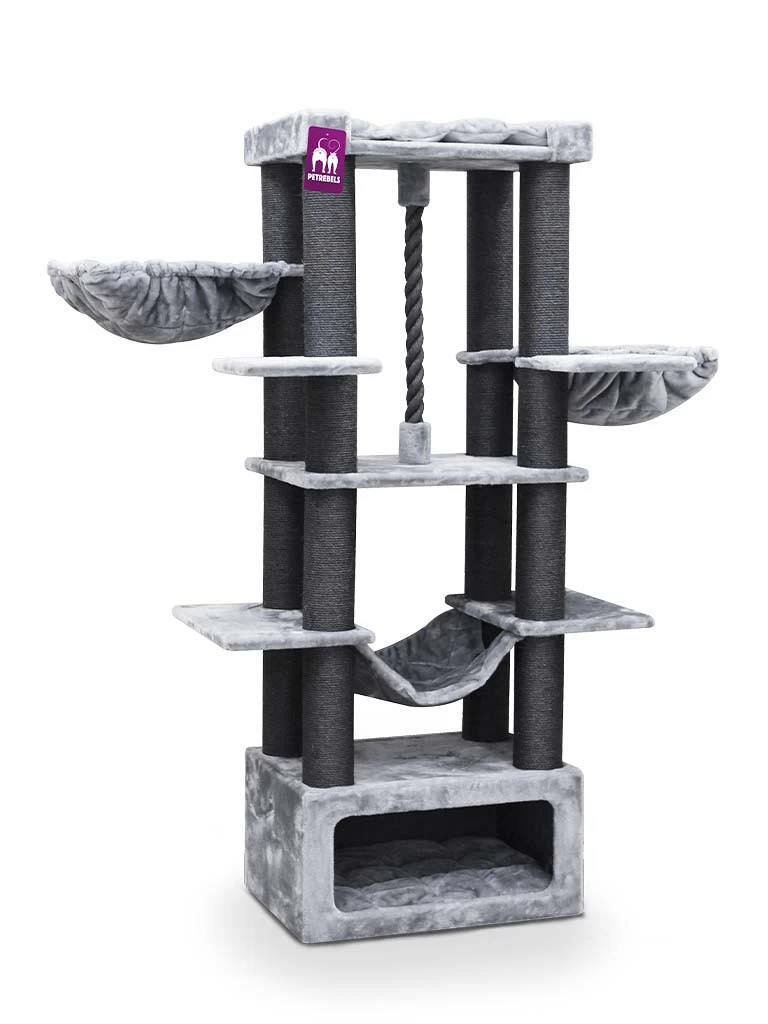 Petrebels krabmeubel Lucky Bastards Riverview 190 heeft ontelbaar veel fluweelzachte slaapplekjes, krabstammen van maar liefst 12 centimeter dik, een stoer speeltouw, twee fijne hangmatten en één nieuwe zwevende loungplek voor de echte luiwammesen. En mooi is hij ook, want door zijn strakke en vierkante vorm past hij bij elke woonstijl.