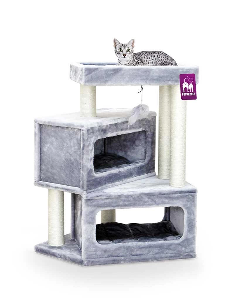 Petrebels krabmeubel Sweet Petite Mansion 100 lijkt wel een luxe appartementencomplex. Deze robuuste krabpaal heeft maar liefst drie etages! Ideaal voor kittens, kleine katten en senioren omdat alles makkelijk bereikbaar is. Jouw katten gaan zich hier uitstekend mee vermaken – ze kunnen veilig slapen in een van de twee slaaphuisjes óf in de chique loungemand bovenop. En hun energie kunnen ze kwijt door aan de krabpalen te krabben, zich te verstoppen of spelen met de Funky Rebel.
