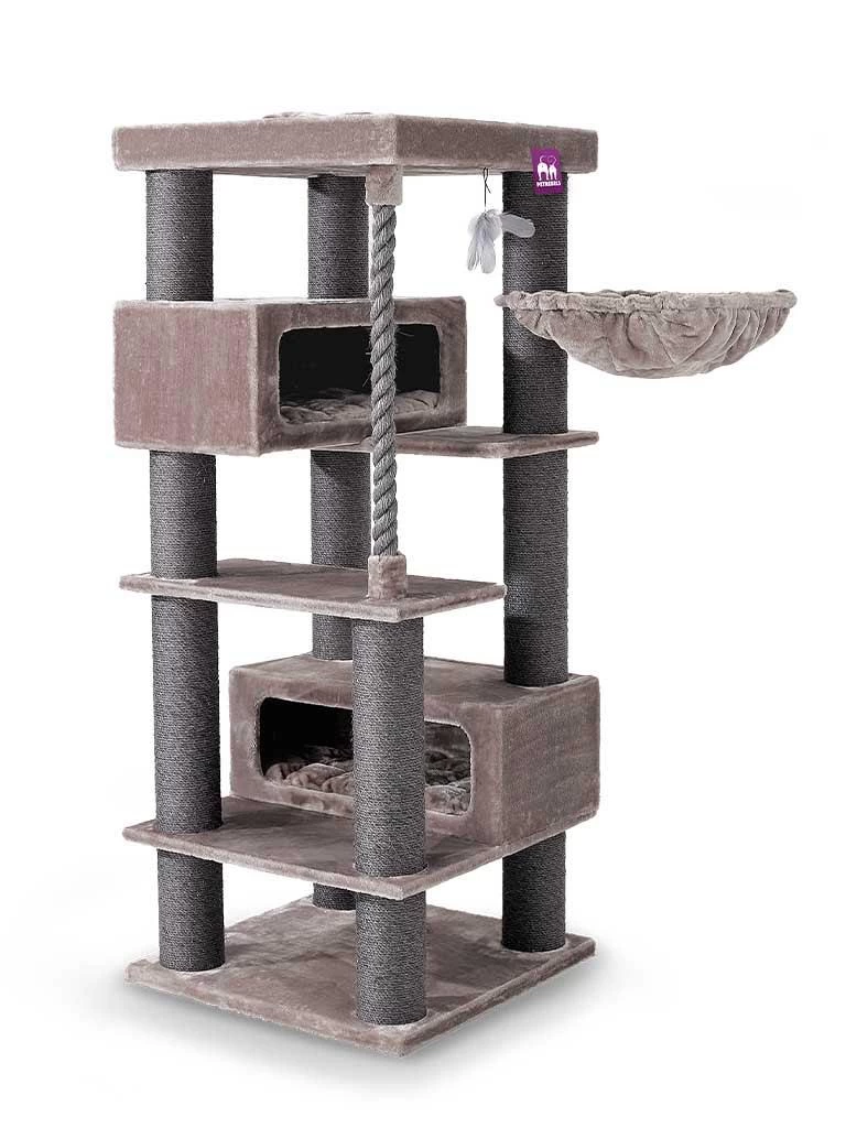 Petrebels krabmeubel Turnpike 190 heeft ontelbaar veel fluweelzachte slaapplekjes, krabstammen van maar liefst 15 centimeter dik, een stoer speeltouw en een fijne hangmat. En mooi is hij ook, want door zijn strakke en vierkante vorm past hij bij elke woonstijl.