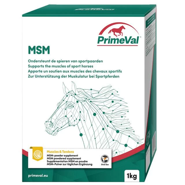 PrimeVal MSM ondersteunt de spieren van sportpaarden. Het wordt aanbevolen voor paarden die topprestaties leveren tijdens een wedstrijdseizoen of bij periodes van training of zware inspanning. Het speelt een rol bij het behoud van sterke en soepele spieren en ondersteunt het herstel van spierweefsel na een prestatie. PrimeVal MSM kan worden gebruikt als dagelijkse aanvulling voor sportpaarden, maar is ook zeer geschikt voor oudere paarden en voor herstel na ziekte.