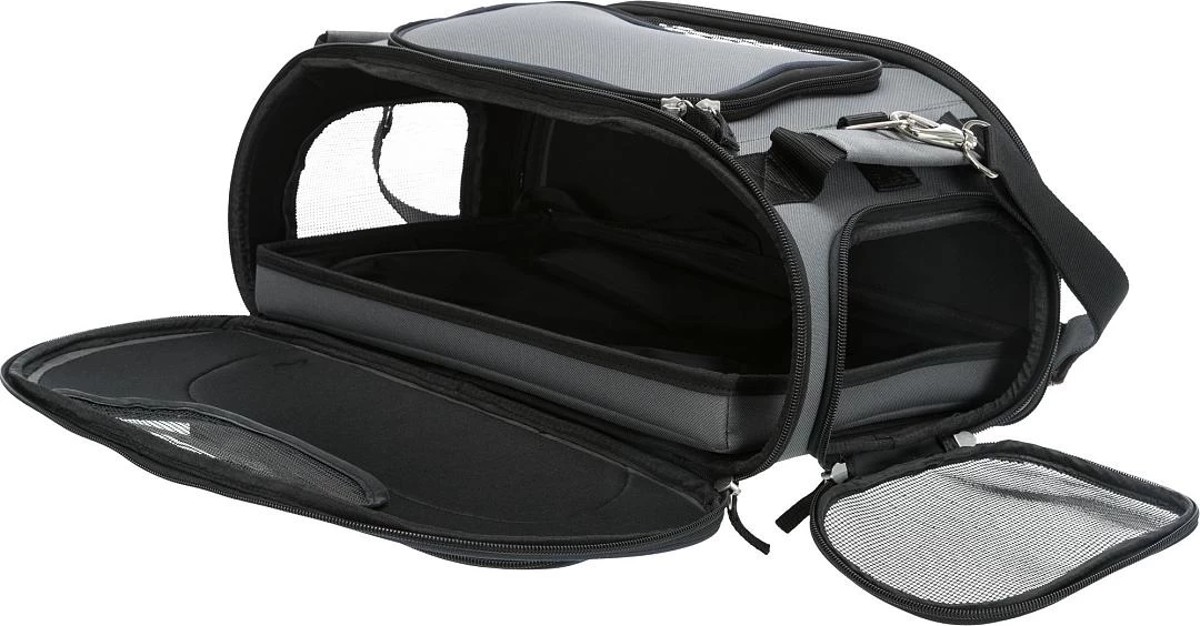 De tas is gemaakt van vormvast EVA met polyester voor een veilige, comfortabele vlucht. De tas is te bevestigen aan een trolley en komt tevens met een afneembare schouderriem en twee handgrepen. Je kunt de tas openen aan de zij-, boven- en voorkant zodat je ook in kleine ruimten altijd voldoende toegang hebt tot jouw dier. In het buitenvak kun je losse spulletjes meenemen. Met geรฏntegreerde korthouder die voorkomt dat jouw dier onverwacht uit de tas kan springen. De gevoerde en watervaste bodemplaat is uitneembaar.