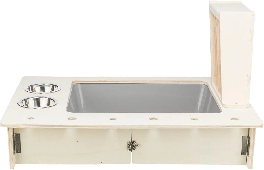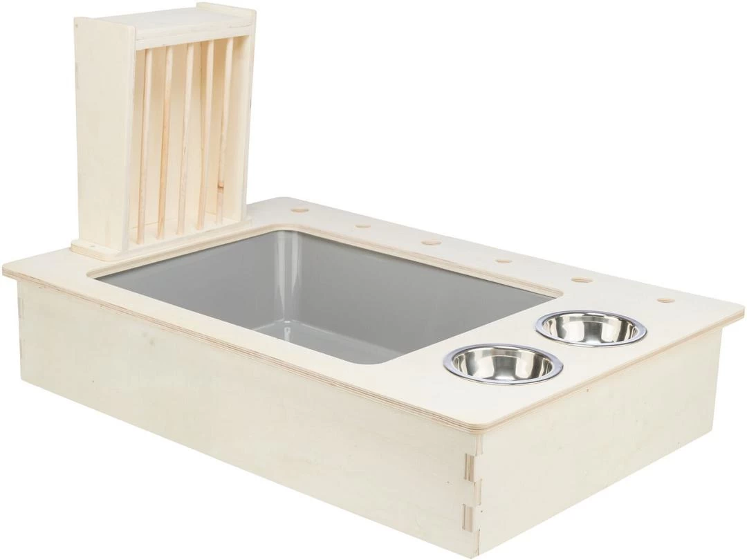 TRIXIE voederstation is een alles in één voederstation. Het heeft 2 rvs voer- of waterbakken, een hooiruif, extra openingen voor takjes en groenten en een uitneembaar toilet van kunststof.