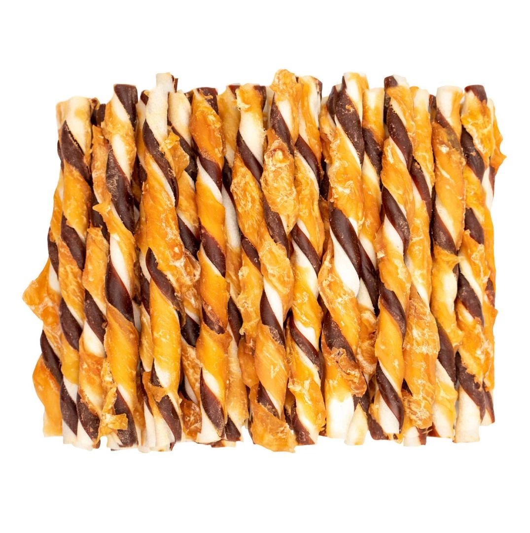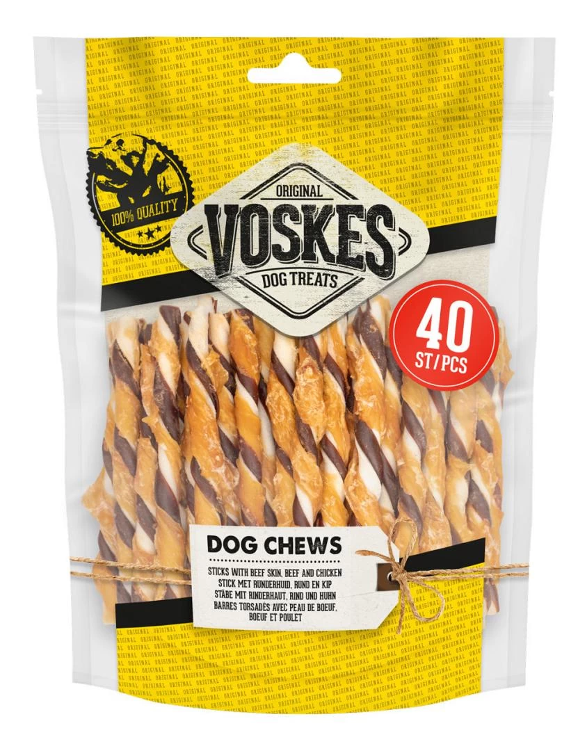 Voskes rund en kip Twist bevat 40 heerlijke sticks van gedroogde kipfilet, rund en runderhuid, om jouw hond extra mee te verwennen. Daarnaast activeert deze heerlijke traktatie het kauwgedrag van jouw viervoeter.