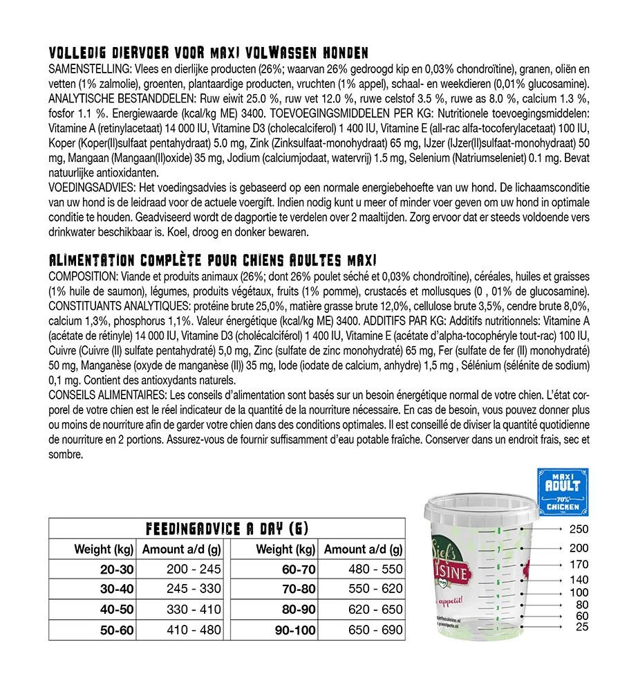 De Yamipets Sjef’s Cuisine hondenvoer Maxi Adult is speciaal ontwikkeld voor de grotere familiehond. Het formaat brok is aangepast aan grotere honden, stimuleert het kauwen en helpt tandplak voorkomen. De uitgebalanceerde ingrediënten zorgt voor een optimale spijsvertering. Door kip als eiwitbron in te zetten heeft de Adult Maxi een zeer hoge acceptatie.