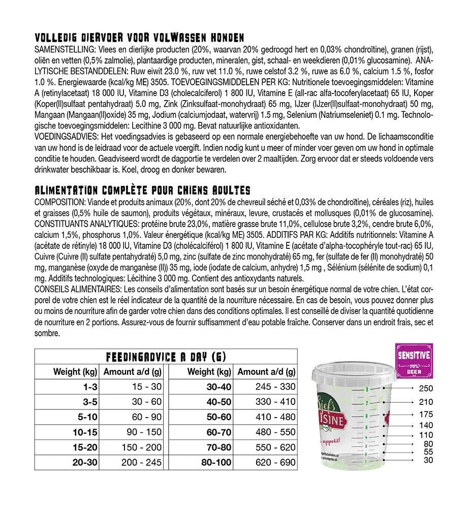 Yamipets Sjef’s Cuisine hondenvoer Sensitive Deer is speciale voeding voor honden met gevoelige darmen. De licht verteerbare en hypoallergene eigenschappen van hert als eiwitbron, maken deze voeding uitermate geschikt ter ondersteuning van intolerantie of allergieklachten. De dierlijke eiwitten en rijst zijn zeer licht verteerbaar en fruit draagt met extra vezels bij aan een optimale spijsvertering.