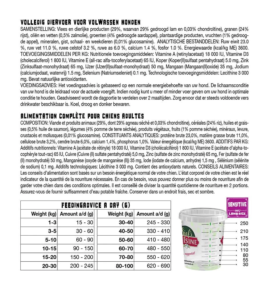 Yamipets Sjef’s Cuisine hondenvoer Sensitive Lamb Rice is uitermate geschikt ter ondersteuning van intolerantie of allergieklachten. Met lam als eiwitbron is deze voeding hypoallergeen en de dierlijke eiwitten en rijst zijn zeer licht verteerbaar.
